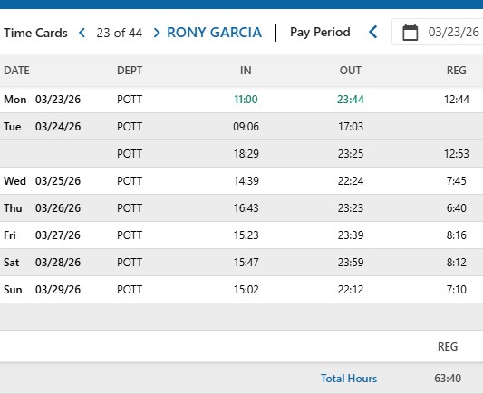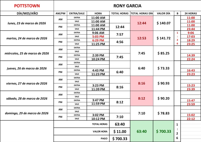 PAYROLL POTTSTOWN ADRIANA FOLGAR ALVARO ALVARADO AMOS VICENTE CARLOS OROZCO FERNANDO CRUZ LEONEL ALARCON MICAELA RAMIREZ RONY GARCIA VICTOR GARCIA ZANDRA MUNZON ZENAIDA PEREZ RESUMEN